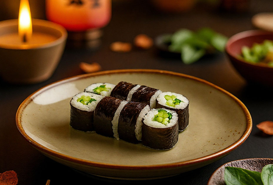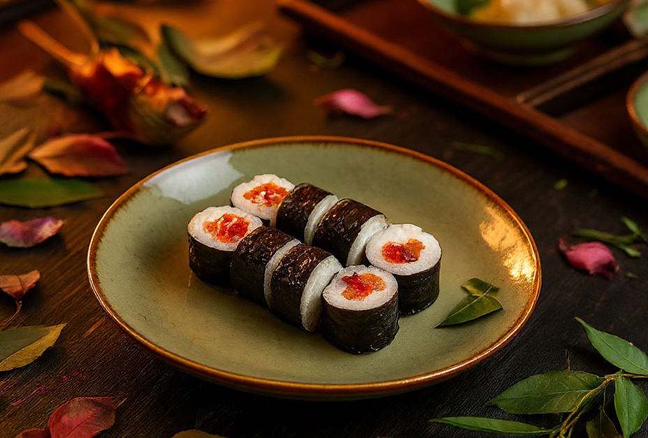 Рис, говядина в терияки соусе, редис, огурцы маринованные, древесный гриб, жаренное яйцо, жаренные баклажаны