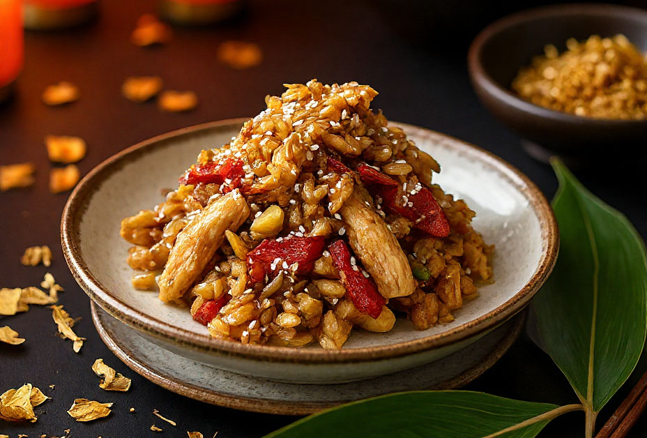 Курица, овощи, соус унаги, кунжут, соевый соус, кунжутное масло