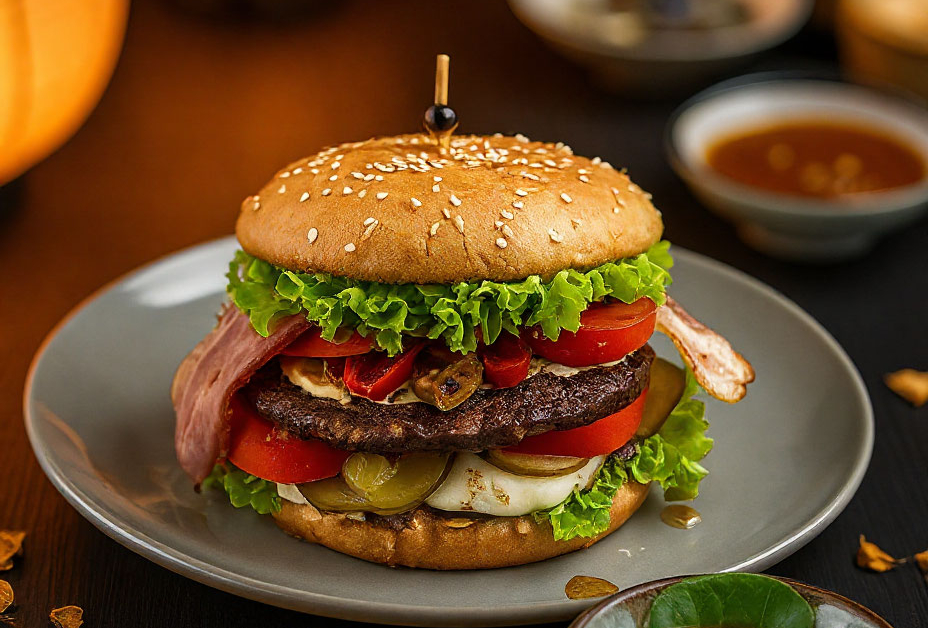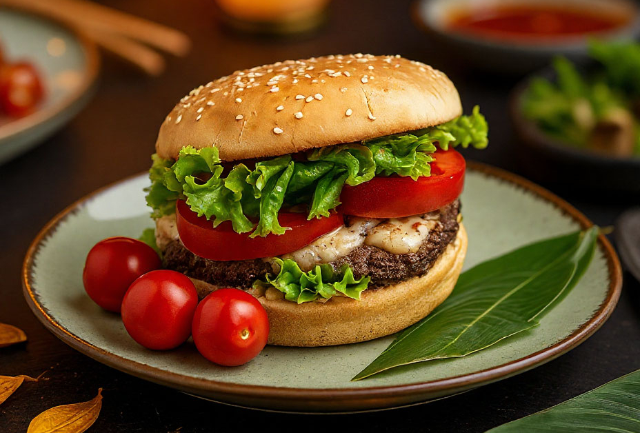 Этот бургер — настоящая находка для ценителей мясных блюд. Сочная говяжья котлета, сыр моцарелла, свежий помидор и хрустящий корнишон — попробуйте бургер, в котором идеально сочетаются вкусы и текстуры.
