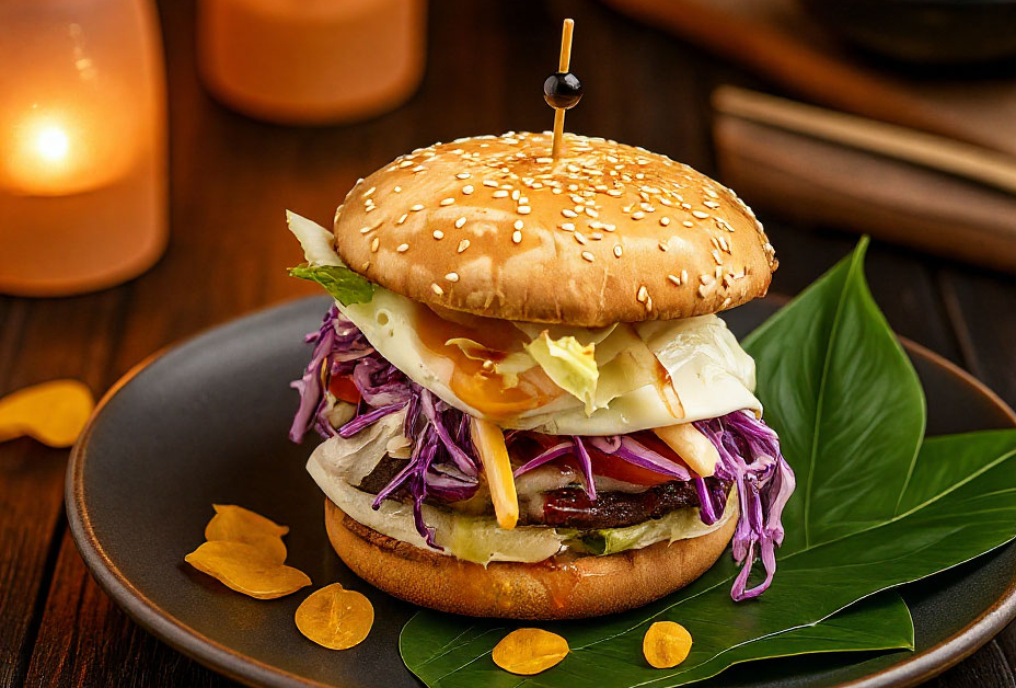 Сочная говяжья котлета с расплавленным сыром моцарелла, ломтиками помидора и листом салата айсберг. Пикантность и остроту мясу придают соусы сладкий чили и барбекю, а яйцо добавляет блюду сытности. Также в бургер добавляют белый соус, который гармонично сочетается с салатом Коул Слоу