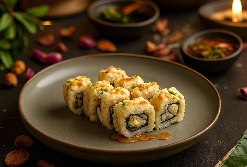 Томаго блин, сыр хохланд, сыр Филадельфия, лосось, огурец, бекон, соус Спайси