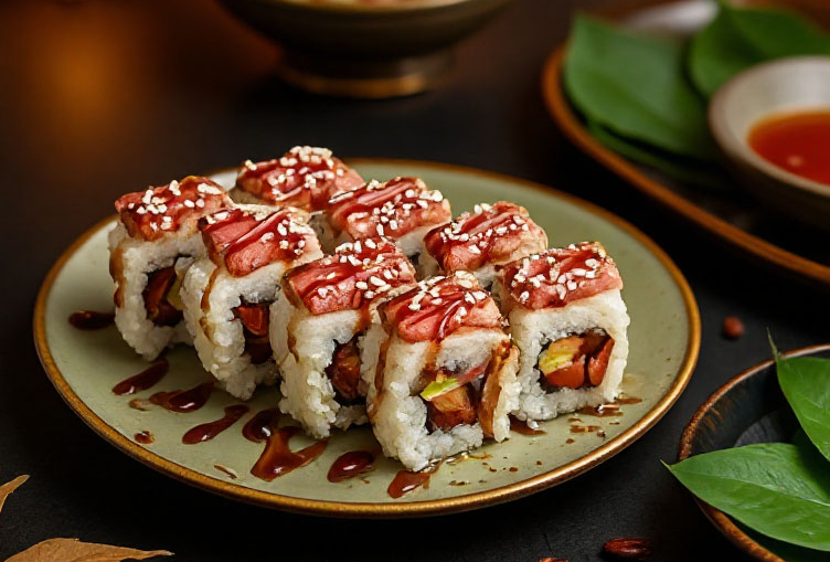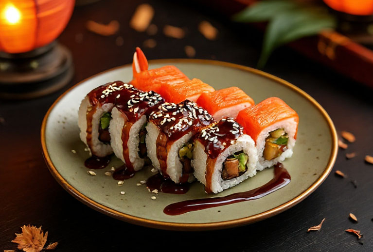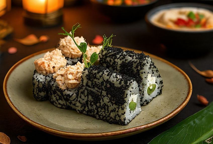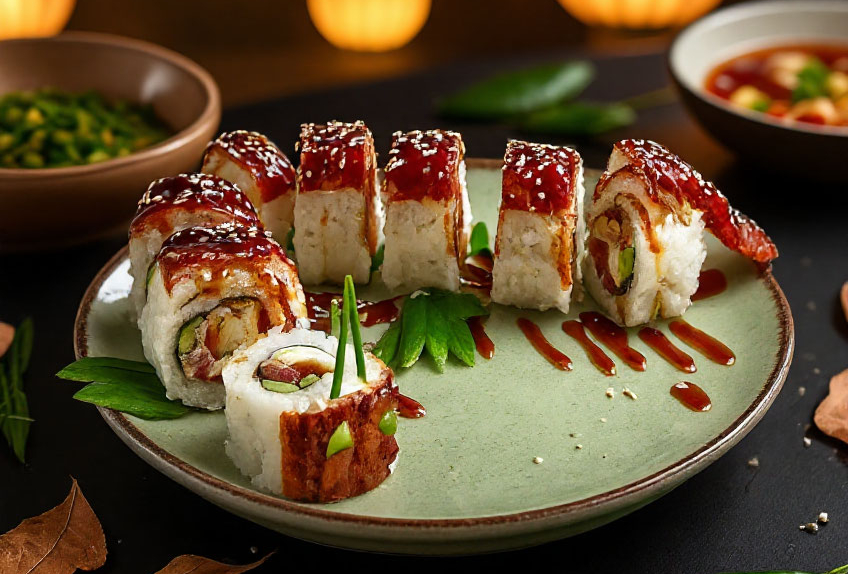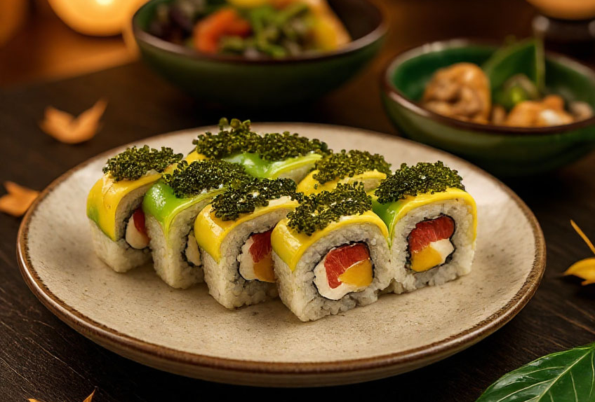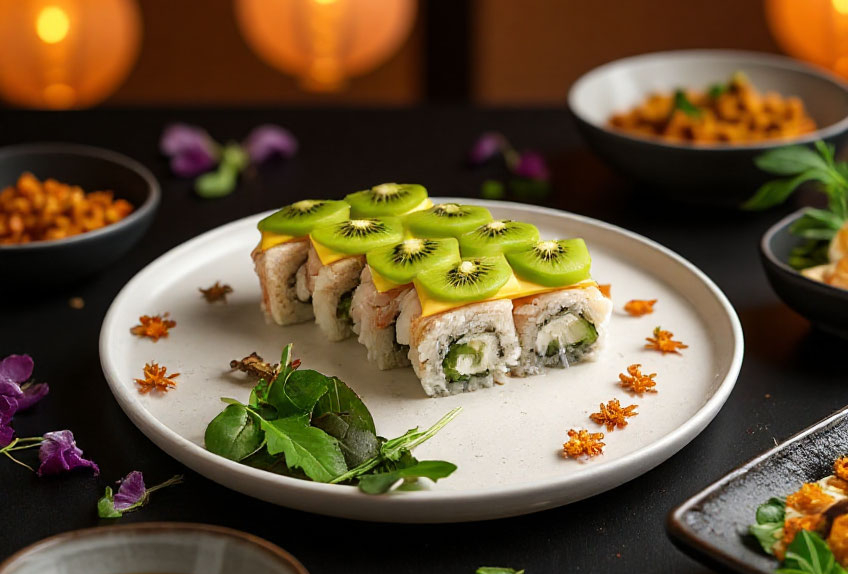 Спайси соус, сыр Филадельфия, креветка, киви, чёрная икра масаго