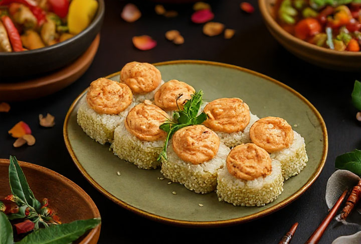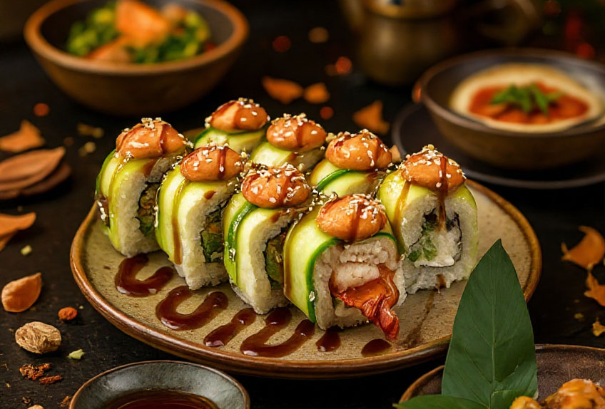 Лосось, кунжут, огурец, соус Спайси, сыр, шапочка из лосося