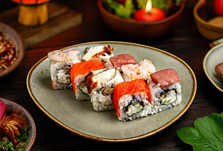 Лосось, огурец, сыр Филадельфия, омлет томаго, угорь