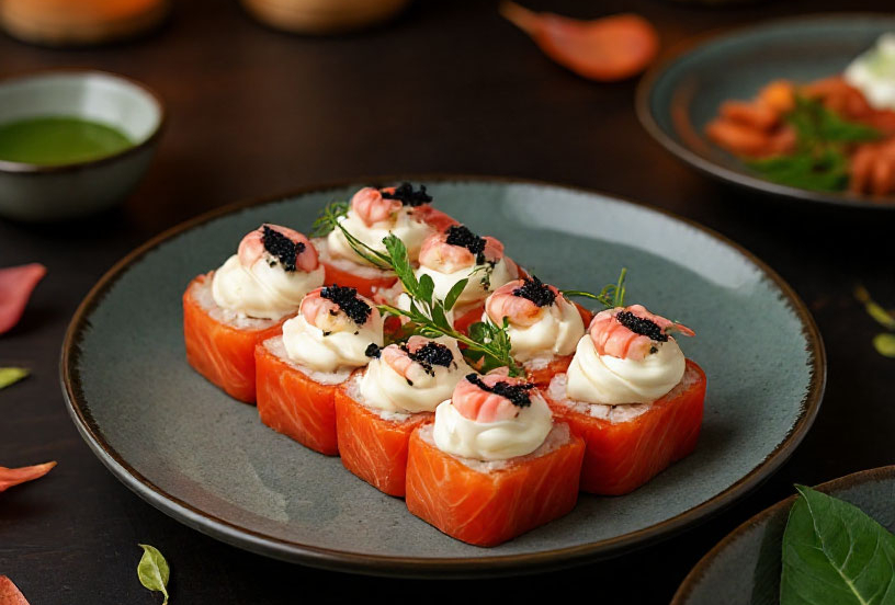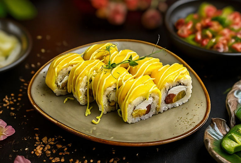 Сыр Филадельфия, лосось, апельсин, манго, авокадо