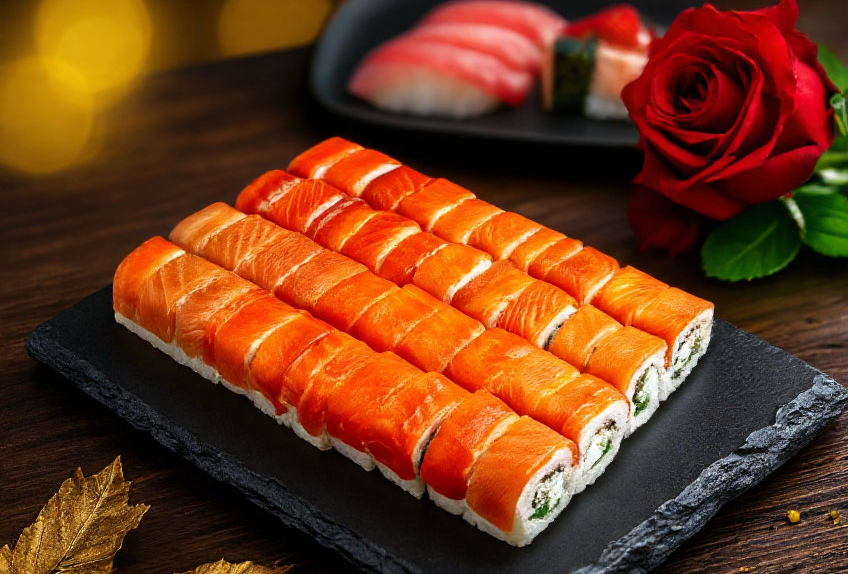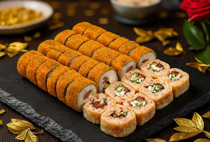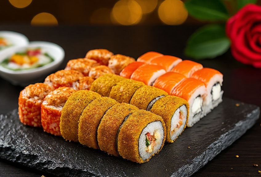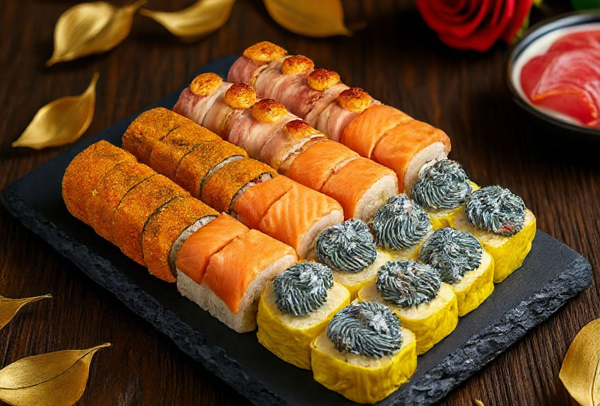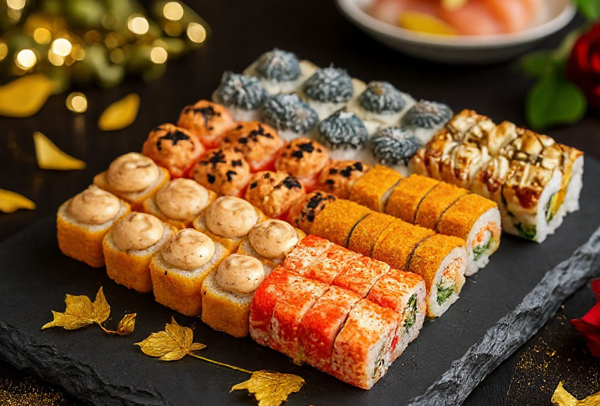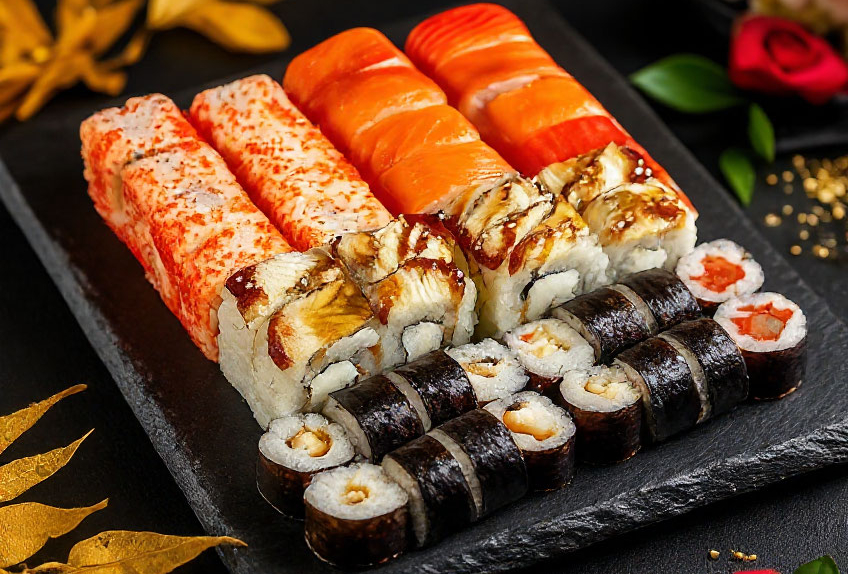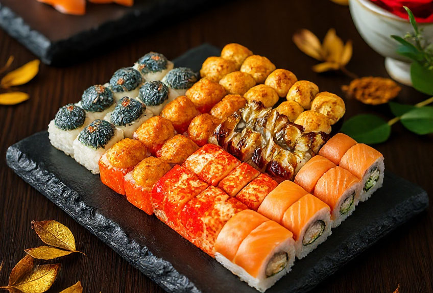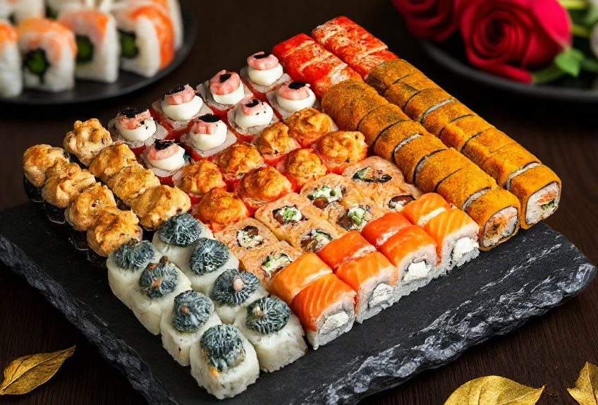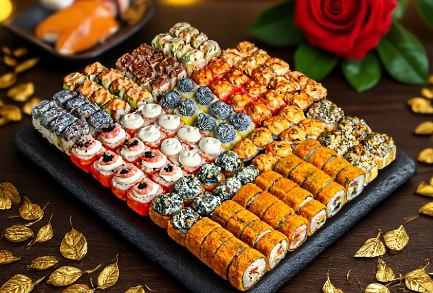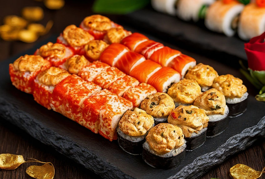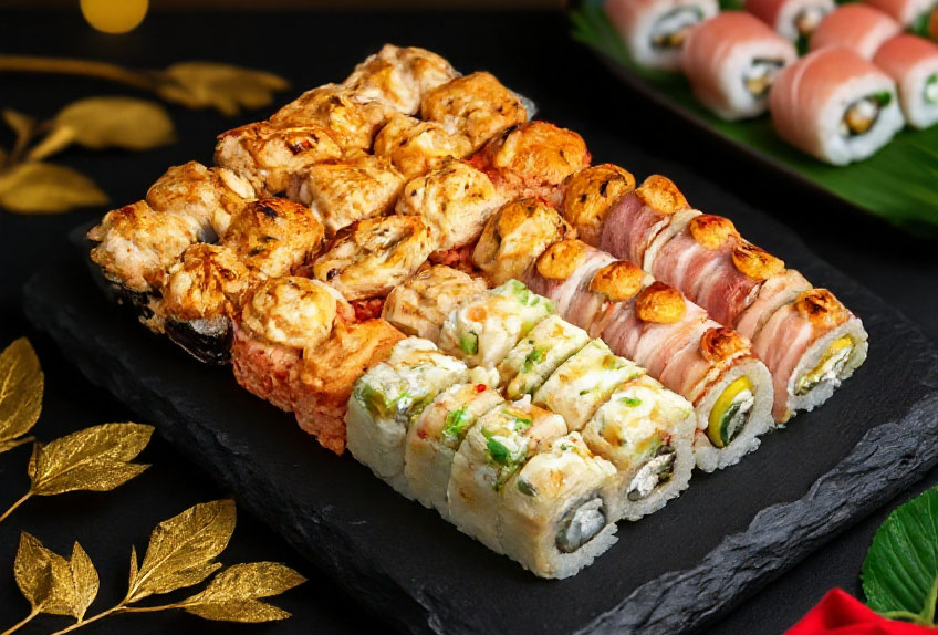 Ролл «Филадельфия чиз», ролл «Калифорния креветка», ролл «Унаги кани», ролл «Запечённое изобилие», ролл «Киото», ролл «Якудза» (48 шт.)